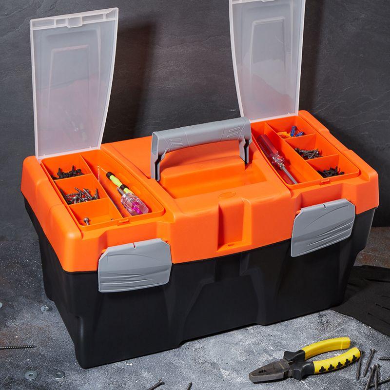 Ящик для инструмента PROconnect пластиковый 500х250х260 мм. Изготовлен из полипропилена, имеет съемный 3-секционный лоток и два встроенных органайзера с крышкой. Ящик предназначен как для хранения, так и для транспортировки инструмента, крепежных изделий, расходных материалов, а также различных предметов схожих по габаритам.