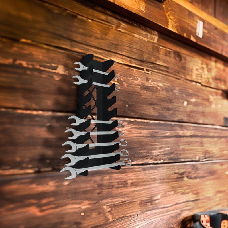 Настенный держатель позволит легко и удобно расположить гаечные или накидные ключи от 5 до 40 мм в гараже, мастерской, кладовке, на балконе, складе и в других местах. Держатель имеет продуманную конструкцию, предусматривающую хранение 9 ключей. Изделие обеспечивает порядок на рабочем месте и быстрый доступ к инструменту, который легко можно достать для проведения монтажных работ, а по их окончании вернуть на место. Для изготовления держателя были использованы экологически чистые и качественные материалы. Материал изготовления – сталь. Цвет – черный. В комплект с изделием поставляется весь необходимый крепеж.