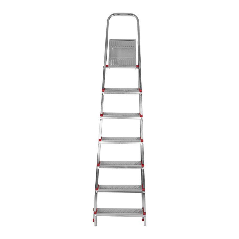 Стальная стремянка REXANT – недорогой и прочный помощник при высотных работах. Применяется как при коммунальной и строительной деятельности, так и в быту, дома, на даче, в гараже и саду. Устойчивая конструкция и надежная фиксация в рабочем положении обеспечивается за счет специального соединительного ушка. Пластиковые ножки предотвращают скольжение и не царапают напольное покрытие. Усиленное упрочненное крепление пластиковых ножек предотвращает их выпадение. Гальваническое покрытие придает надежную устойчивость к коррозии. Передовая технология заклепочного крепления ступенек. Широкие ступени с противоскользящим рифлением. Технические характеристики: Количество ступенек: 7 Высота площадки: 146 см Высота стремянки в разложенном состоянии: 189 см Габаритная высота: 208 см Ширина: 51 см Длина: 130 см Вес: 7,8 кг Максимальная нагрузка: 150 кг