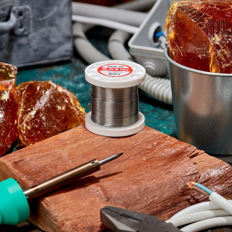 Припой с канифолью ПОС-61, 100г, Ø0,8мм, (олово 61%, свинец 39%), катушка REXANT