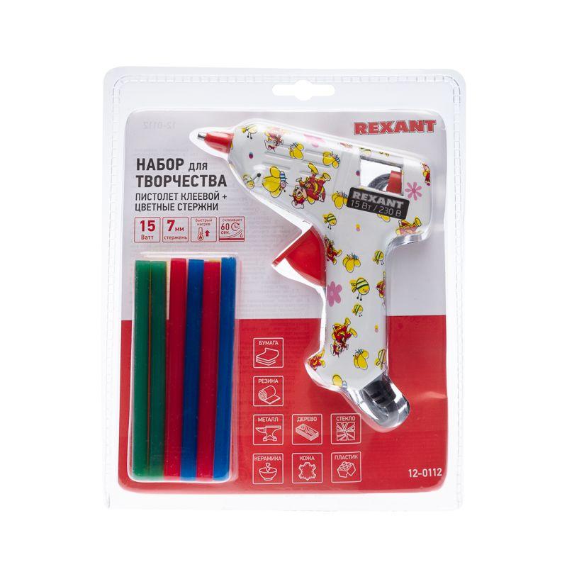Пистолет клеевой, 15Вт, Ø7мм + набор цветных стержней 12 шт, блистер REXANT