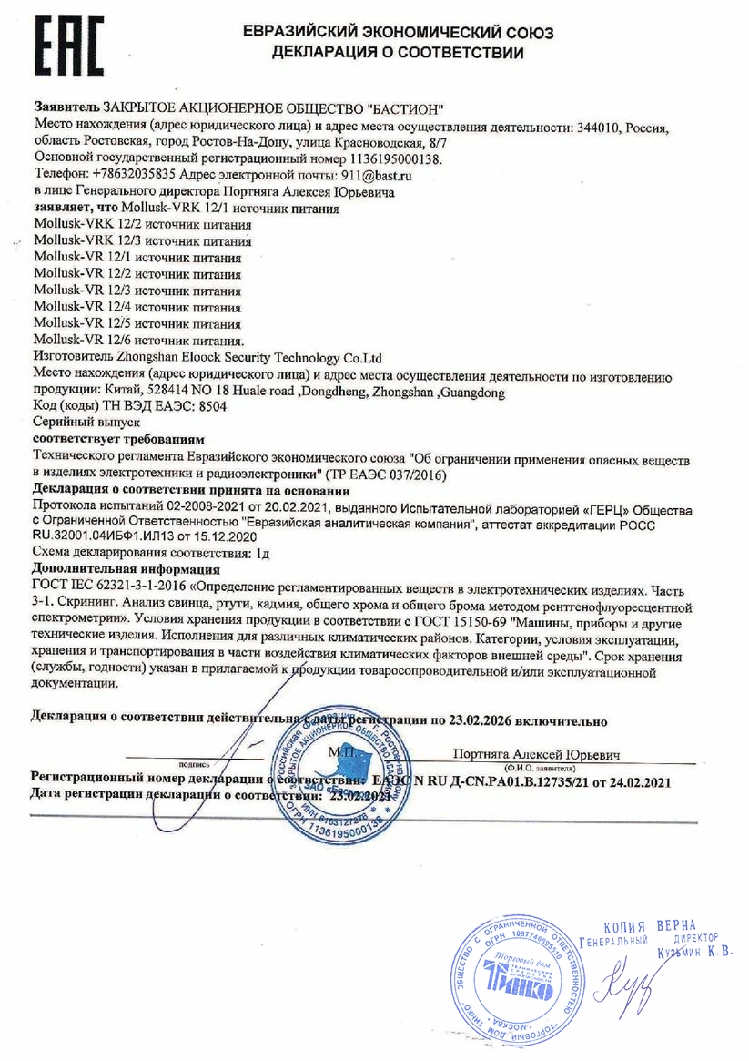 Mollusk-VRK 12/3 источник питания 12В, 3А. Сетевой диапазон 110-245В встр. вилка