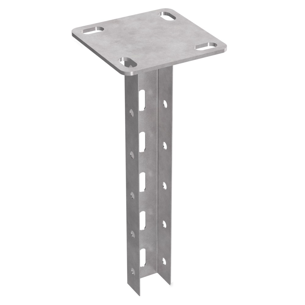 Стойка потолочная для средних нагрузок 45х30 с пяткой 120х120 это опорное изделие, состоящее из П-образного профиля и квадратного основания, сваренных между собой. П - образный профиль и квадратное основание из стали 4 мм. позволяют крепить стойку к потолку. Разные исполнения по длине данного изделия дают возможность подбирать оптимальный вариант для формирования нужных конструкций. Вдоль всего профиля имеется перфорация по трем плоскостям, обеспечивающая удобный монтаж двухстороннего стоечного кронштейна на необходимой вам высоте. Ширина профиля обеспечивает дополнительную жесткость и прочность создаваемых конструкций кабеленесущих систем.