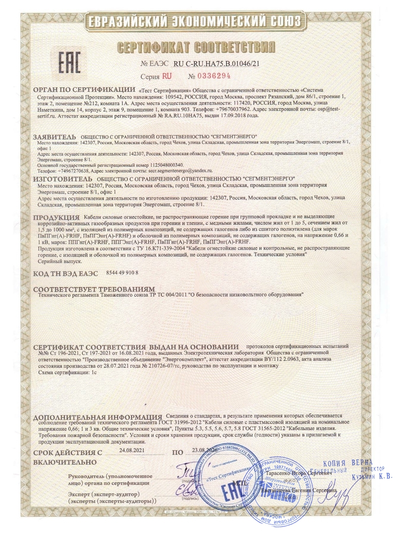 Назначение и область применения Кабели силовые для передачи и распределения электроэнергии в стационарных установках при номинальном переменном напряжение 0,66 и 1 кВ номинальной частотой 50 Гц. Для передачи и распределения энергии и электрических сигналов Для систем энергоснабжения на объектах повышенной пожарной опасности В зданиях и сооружениях с массовым пребыванием людей: в офисных помещениях, оснащенных компьютерной и микропроцессорной техникой, в детских садах, школах, больницах и для кабельных линий зрелищных комплексов и спортивных сооружений. Конструкция Токопроводящая жила Медная однопроволочная до 16 сечения, выше допускается медная многопроволочная Огнестойкий барьер В виде обмотки токопроводящей жилы двумя слоями слюдосодержащей ленты Изоляция Из не распространяющей горение, полимерной композиции не содержащей галогенов; Заполнение Из не распространяющей горение, полимерной композиции не содержащей галогенов; Оболочка Из не распространяющей горение, полимерной композиции не содержащей галогенов;