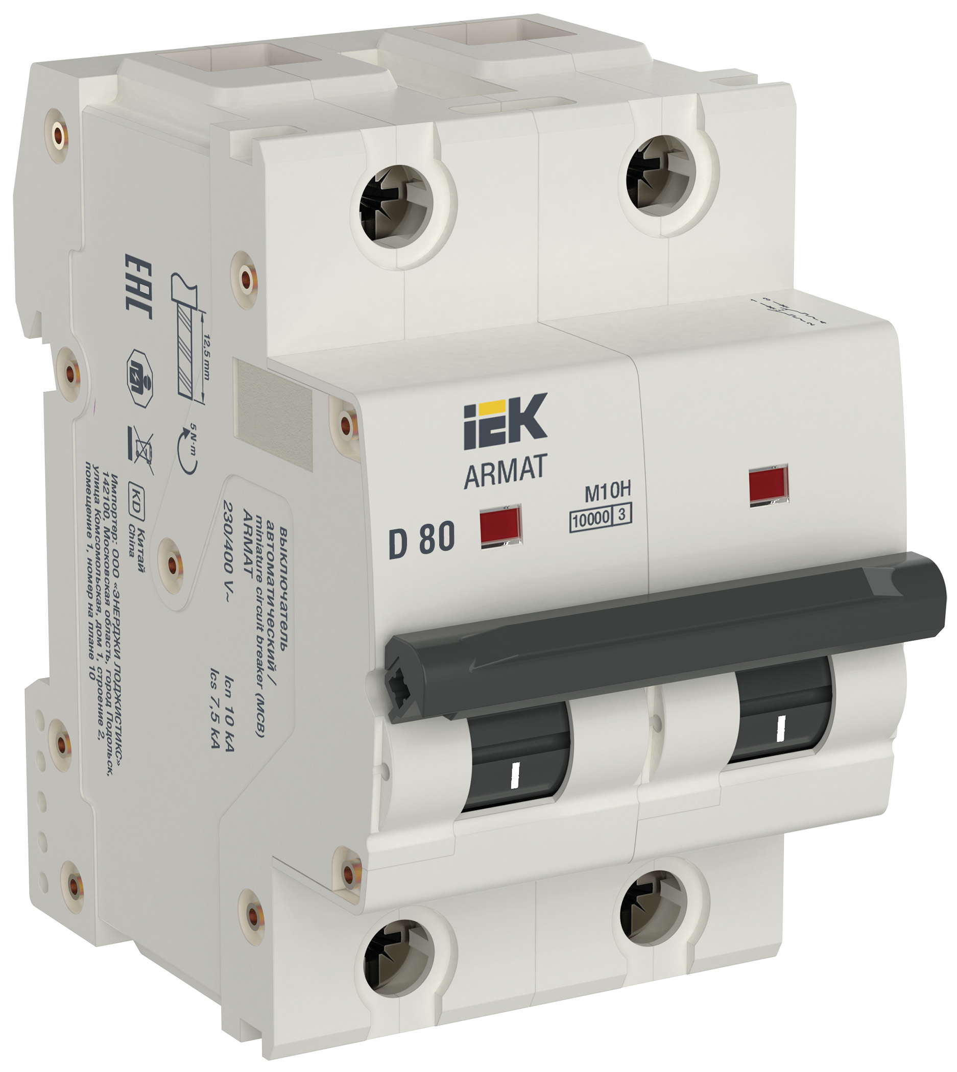 Автоматические выключатели ARMAT серии M10H предназначены для защиты цепей от перегрузки и короткого замыкания. Модельный ряд включает в себя устройства с характеристиками срабатывания B, C, D и Z, L, K на номинальные токи 80 и 100 А с числом полюсов от 1Р до 4Р. Номинальная наибольшая отключающая способность автоматических выключателей ARMAT серии M10H составляет 10 кА. Автоматические выключатели ARMAT серии M10H соответствуют ГОСТ IEC 60947-2 и ГОСТ IEC 60898-1. Конструкцией автоматических выключателей ARMAT серии M10H обеспечивается двойной разрыв контактной системы и двойная дугогасительная камера с совокупным числом де-ионных пластин 24, это двукратно увеличивает падение напряжения на электрической дуге в момент коммутации, за счет чего достигается быстрое и эффективное дугогашение.