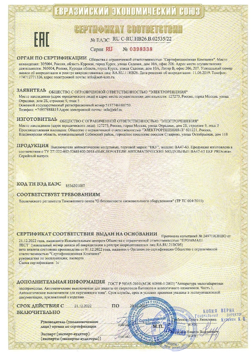 Автоматический выключатель 1P 20А (C) 4,5kA ВА 47-63 EKF PROxima