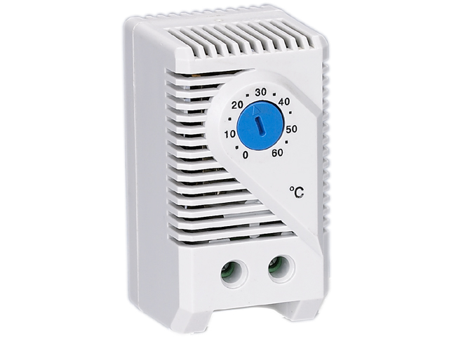 Предназначен для включения вентилятора в диапазоне температур от 0 до +60°C. Разность температур переключения 7 K, погрешность ± 4 К. Имеет компактный пластиковый корпус IP20, серого цвета (В.Ш.Г.) 60 x 33 x 43 мм. Устанавливается на DIN-рейку 35 мм. Подсоединяется двухполюсным зажимом, предусмотрено использование жестких проводов до 2,5 мм либо многопроволочных с наконечни-ком 1,5 мм. Максимальный момент затяжки зажима 0,5 Нм. Максимальная коммутационная способность AC 250В, 10(2)A; AC 120В, 15(2)A; DC 30 Вт. Температура эксплуатации и хранения от -45 до +80 °C. Нормальной-открытый контакт (NO). Срок службы 100 000 циклов. Вес 40 гр., поставляется в индивидуальной упаковки.