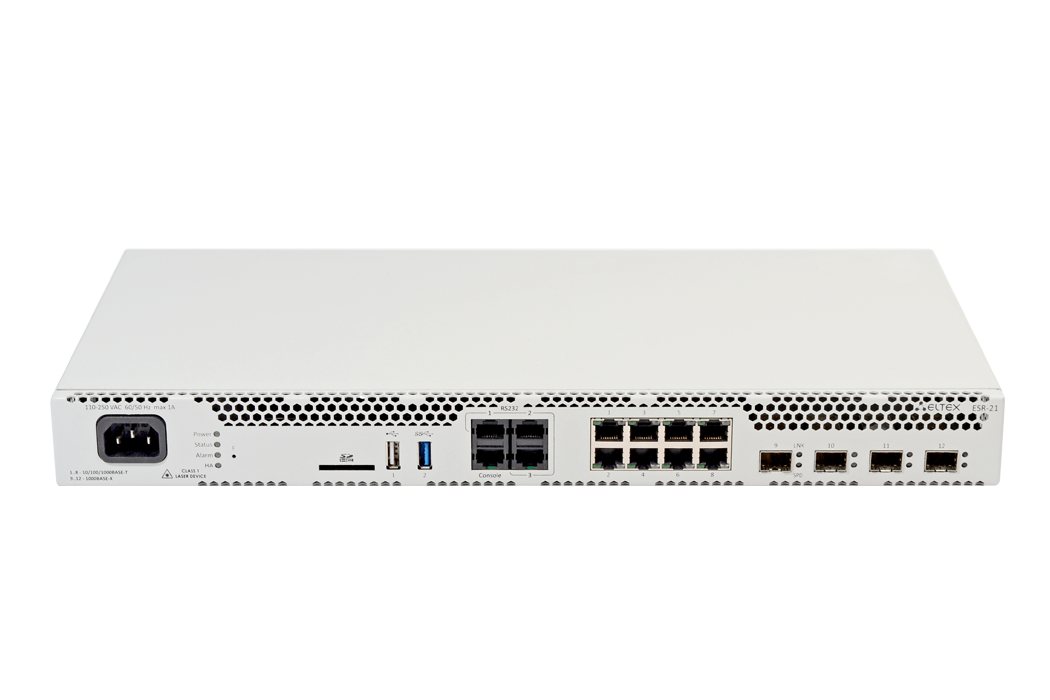 Сервисный маршрутизатор ESR-21: 8хEthernet 10/100/1000 Base-T; 4хEthernet 10/100/1000 Base-X (SFP); 1xRS-232 (RJ-45); 3xSerial (RS-232); 2 порта USB2.0