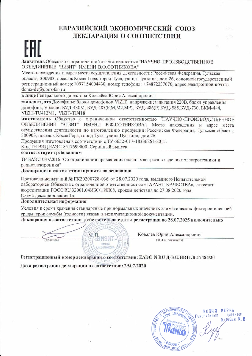 Блок управления домофона БУД-485Р: блок управления домофона БУД-485Р работает в комплекте с блоками вызова серий 300 и 400 (кроме БВД-311, БВД-313, БВД-321, БВД-341) для входа на придомовую территорию; количество абонентов - до 2400 (до 12 подъездов по 200 квартир); память на 28800 (до 12 подъездов по 2400 ключей) ключей VIZIT-TM и/или VIZIT-RF2х (VIZIT-RF3х) в зависимости от исполнения БВД; дуплексная громкоговорящая связь с абонентом; возможность установки/изменения пользователем индивидуального кода доступа; автоматическая компенсация сопротивления линии, повышающая устойчивость работы разговорного тракта при длинных линиях; голосовые пользовательские сообщения на 4-х языках: русский, английский, китайский, чешскийвозможность объединения нескольких домофонов в систему по интерфейсу RS-485 для удаленного управления/администрирования с автоматизированного рабочего места или АРМ «Gate»; ведение протокола событий с привязкой по времени (при работе с АРМ); электронная регулировка громкости в БВД; электронная