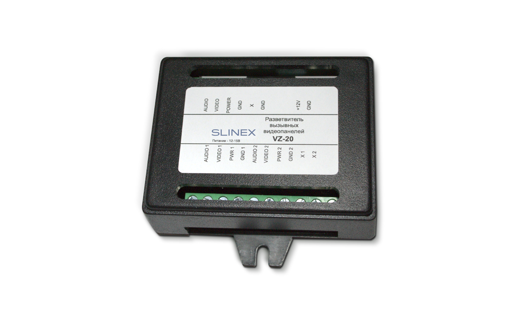 Разветвитель вызывных видеопанелей Slinex VZ-20. Предназначен для расширения количества видеопанелей в индивидуальных домофонных системах. Расширение до двух видеопанелей на один канал видеодомофона. Работает со всеми видеопанелями 4-х проводного стандарта «Commax». Напряжение питания коммутатора составляет от 12 до 15В. Количество подключаемых видеопанелей при помощи коммутатора VZ-20 - 2шт. Стандарт подключения видеодомофона - 4-х проводный Slinex, Commax, Kocom, Activision, JSB, Ercon, Hyundai, Эликс и друге. Имеются два режима просмотра видео с вызывных панелей - задается перемычкой. Первый - просмотр только первой вызывной панели (по умолчанию). Второй - просмотр последней активной вызывной панели (снятая перемычка).