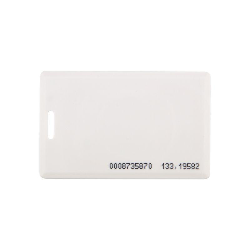 Ключ электронный 125KHz формат EM Marin имеет размеры обычной кредитной карты.Бесконтактные карты используются в системах контроля доступа для идентификации личности. В карту занесен код. При поднесении к бесконтактному считывателю код с карты считывается и передается в контроллер. Преимуществом электронных пропусков является возможность использовать их не только в качестве бесконтактной идентификации личности, ключа для доступа в помещение, но и для организации контроля трудовой дисциплины и учета рабочего времени. Размеры (мм): 85.5×54×1.88 Рабочая частота: 125KHz Тип памяти: Только чтение Материал: PVC Возможность нанесения логотипа: да; Температура хранения: -40°С…+75°С;