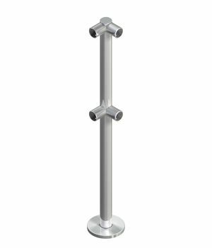 Стойка из 48 мм нержавеющей трубы (AISI 304) на фланце, 2 пары муфт - D38 под углом 90 град. Применяется как угловая стойка под поручень диаметром 38 мм. Расстояние между муфт по вертикали - A=400 мм.