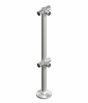 Стойка из 48 мм нержавеющей трубы (AISI 304) на фланце, 3 пары муфт - D38 установлены Т - образно. Применяется как стыковочная стойка под поручень диаметром 38 мм. Расстояние между муфт по вертикали - A=600 мм.