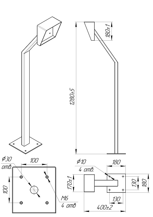 Наклонная стойка (150 град.) для установки считывающих устройств СКУД, высота 1270 мм, труба 30х60 мм, защитный кожух 170х180мм с диэлектрической пластиной, основание 180х180 мм, электрический клеммник, закладная пластина для бетонирования + комплект оцинкованного крепежа, цвет оранжевый по шкале RAL 2008