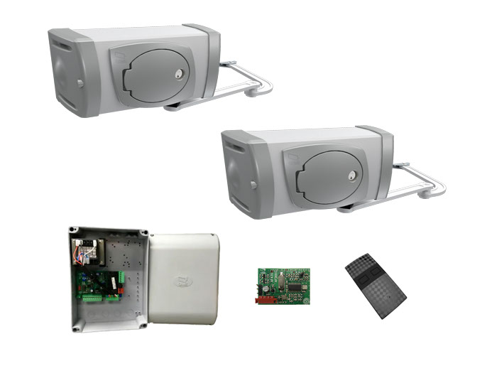 (8K01MB-026) Комплект автоматики для двухстворчатых распашных ворот (блок ZA3P, радиоуправление, фотоэлементы). Комплект в составе: (001FE40230) FE40230 - Привод 230 В рычажный, самоблокирующийся с энкодером и шарнирным рычагом передачи; (002ZA3P) ZA3P - Блок управления с расширенным набором функций; (001AF43S) AF43S - Плата-радиоприемник 433.92 МГц; (806TS-0130) TOP44RGR - Брелок-передатчик 4-х канальный с динамическим кодом; (001DIR10) DIR10 - Фотоэлементы / передатчик, приемник / накладные, дальность 10 м