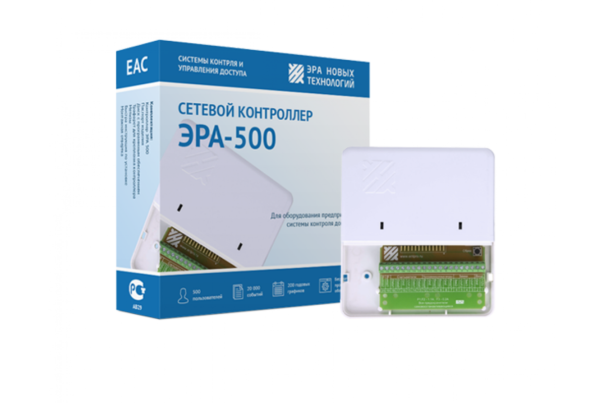 Сетевой контроллер СКУД «Эра-500» с подключением по сети Ethernet, обеспечивает управления доступом в офисах или объектах с численностью сотрудников не более 500 человек. Он хранит в собственной памяти информацию о 30 000 событиях. Устройство способно обслуживать одну полноценную точку прохода через интерфейс от Wiegand-4 до Wiegand-64 или две точки через Touch Memory. Идентификация пропусков происходит на основе Proximity карт или карт с чипом. Выход «открытый коллектор» в приборе предназначен для управления электромеханическими и электромагнитными замками, кнопкой выхода. Кроме того, контроллер взаимодействует с турникетами (в том числе, с моделями, оснащенными картоприёмниками). «Эра-500» поддерживает 50 графиков прохода и 50 временных режимов для них. В комплект прибора входит бесплатное фирменное программное обеспечение, которое можно доработать под индивидуальные требования пользователя. В ПО включены средства автоматизированного формирования отчётов и рассылки авторизованным лицам, программа интеграци