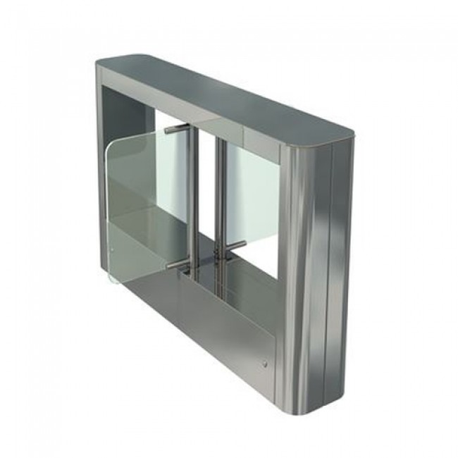 ОДНА толстая центральная стойка турникета. ДВЕ створки из закаленного СТЕКЛА установлены на валы стойки. ДВА моторных привода створок. ДВА блока по 8 фотодатчиков для оптической линий контроля. Встроенные яркие LED индикаторы. Пульт СИСТЕМНЫЙ, кабель управления и ...