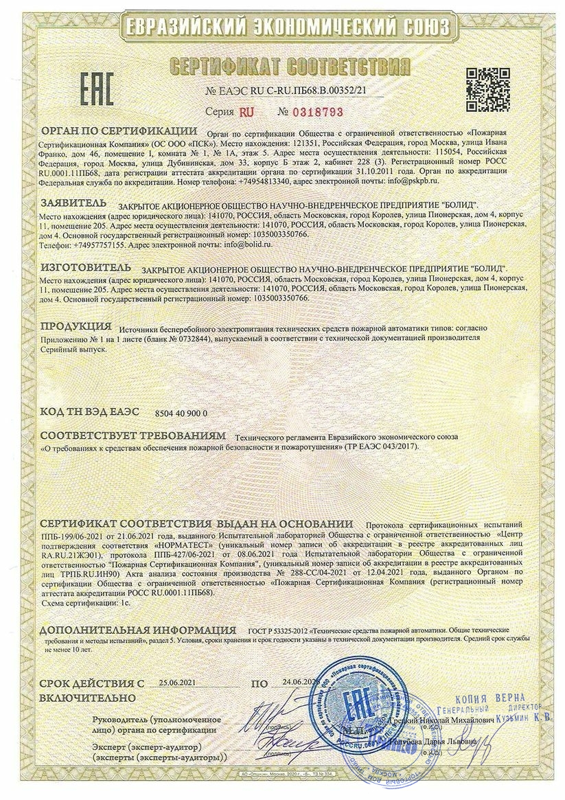 Резервированный источник питания; U-вх.150…250 В, U-вых.26.6…27.8 В, I-ном.2 А, I-max.2.5 А (до 10 минут), под два АКБ 12 В 7 А·ч; световая и звуковая индикация режимов работы, интерфейс RS-485 ИСО "ОРИОН", программируемый оптоэлектронный выход, защита от короткого замыкания, защита аккумулятора от глубокого разряда; IP30, t-раб.-10…+40°С, 230×320×110 мм