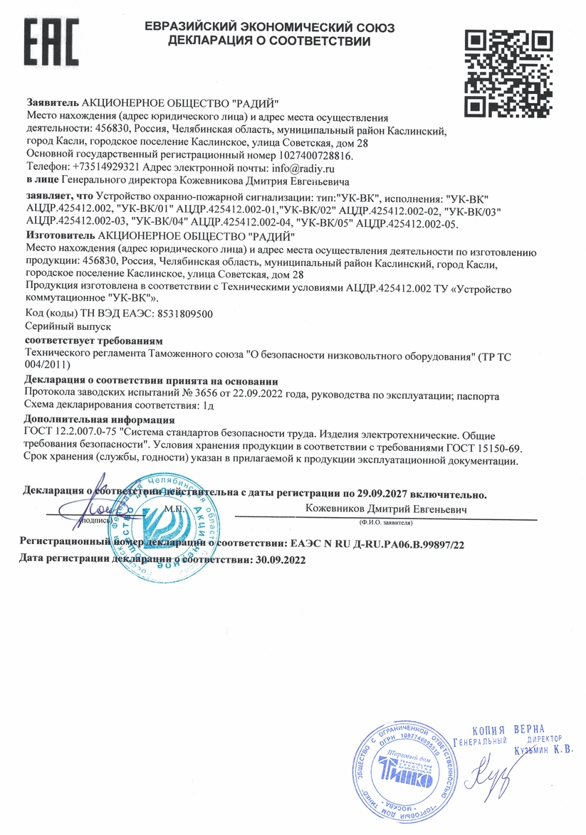 Устройство применяется в системах охранно-пожарной сигнализации и предназначено для управления подключением и отключением приборов, входящих в состав систем охранно-пожарной сигнализации, коммутацией исполнительных устройств (ламп, сирен, видеокамер, систем пожаротушения, электромагнитных замков и т.д.) к сети переменного тока номинальным напряжением 220В или источнику постоянного тока до 30В путем замыкания и размыкания контактов реле.