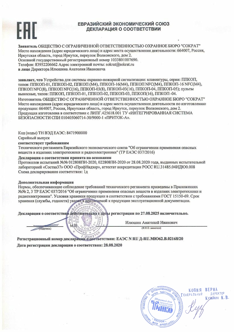Сенсорная клавиатура для работы с приборами Приток- А-КОП. Подключение по шине расширения. Считыватель брелоков Приток-NFC. Индикация 16 шлейфов. Питание 12 В. Корпус М7.