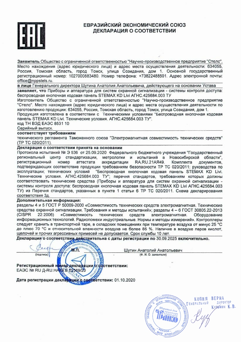 STEMAX KD Livi подключается к объектовому оборудованию для ввода кодов постановки объекта на охрану и снятия с охраны, поддерживает цифровой код длиной до 12 символов. Устройство передает код доступа базовому контроллеру по радиоканалу, а также формирует и передает контроллеру сигнал SOS. Кодовая панель подтверждает выполнение действий с помощью звукового и светового оповещения. При возникновении ошибок в работе KD Livi включает индикацию в соответствии с типом ошибки.