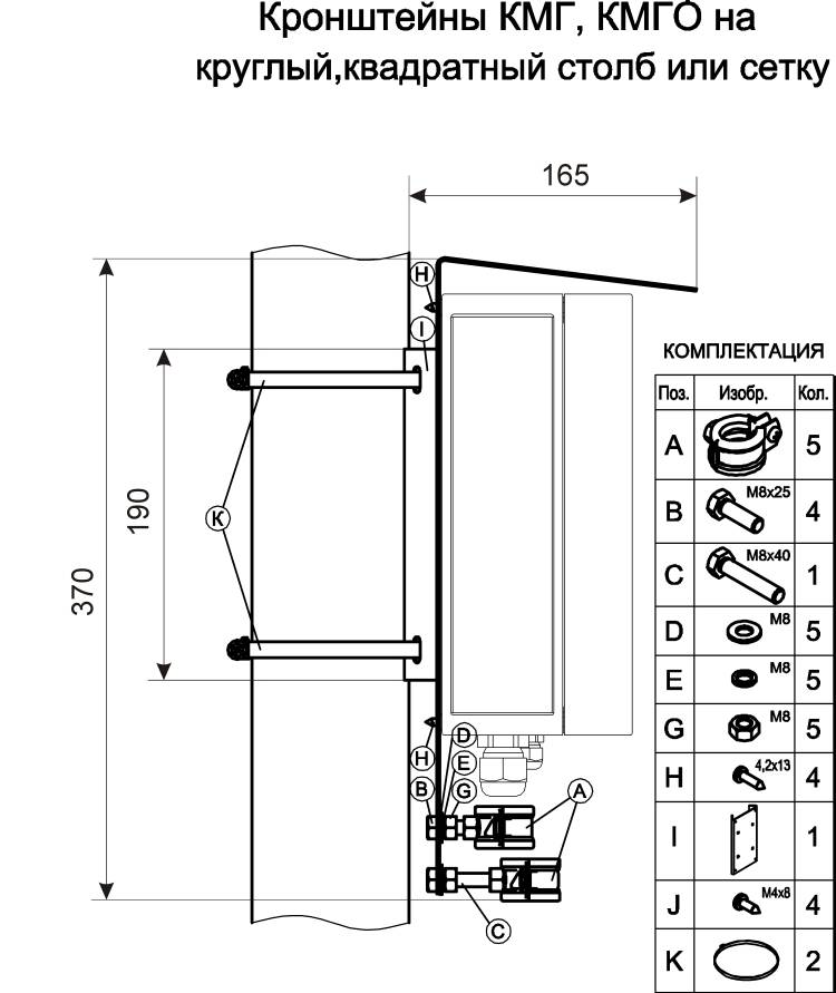 Кронштейн КМГ- 4 предназначен для крепления коробок монтажных КМГ, КМГО на квадратные и круглые опоры ?, Ø = 115 ÷ 135 мм (другой размер – под заказ) и крепления (фиксации) подводящих кабелей или металлорукавов.