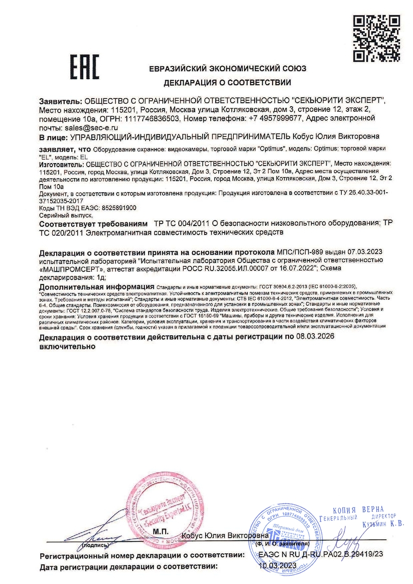 1/3” 4Мп Progressive Scan CMOS SC401AI, GK7205V500, H.265/H.264, фиксированный объектив 2.8мм, Цв. 0.01Лк (F1.2), ч/б 0.001 Лк (F1.2), 0 Лк при включенной ИК подсветке, ИК-подсветка 3 ИК диода, дальность до 20м, SmartIR, DWDR, Встроенный микрофон, Optimus Connect, DC12В(450мА), внешний PoE max 6Вт (на кабеле), -45С...+50С, 90х98 мм, 300 г, Антивандальный корпус, Металл (Алюминий), Пластик, класс защиты IР65.