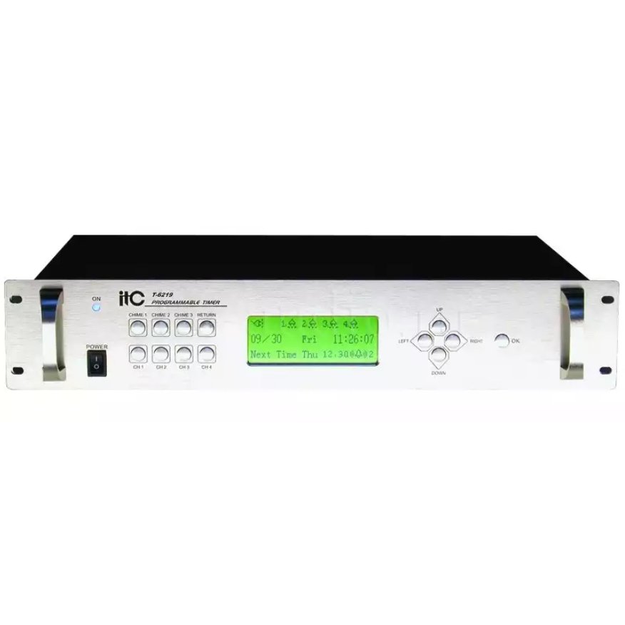 ITC T-6219 – многофункциональный программируемый таймер для интеллектуальных систем музыкальной трансляции и аварийного оповещения, построенных на базе оборудования ITC ESCORT. Прибор выполняет управление устройствами по заранее настроеннім пользователем программам-сценариям – включает/выключает проигрыватели TW-080 и TW-082, тюнер TW-081 и др., а также выполняет запуск аварийного оповещения по управляющему сигналу от внешнего оборудования, например от ППКП системы ОПС. Удобство эксплуатации обусловлено наличием механических кнопок управления и информативного ЖК дисплея, а также дополнительных функций, таких как копирование заданных программ и их редактирование, установка таймера на 1 день или неделю, восстановление настроек после непредвиденного отключения от электроснабжения. Блок выпускается в металлическом корпусе 19'' высотой 2U, питание получает от внешнего источника AC 220 В, 50/60 Гц.