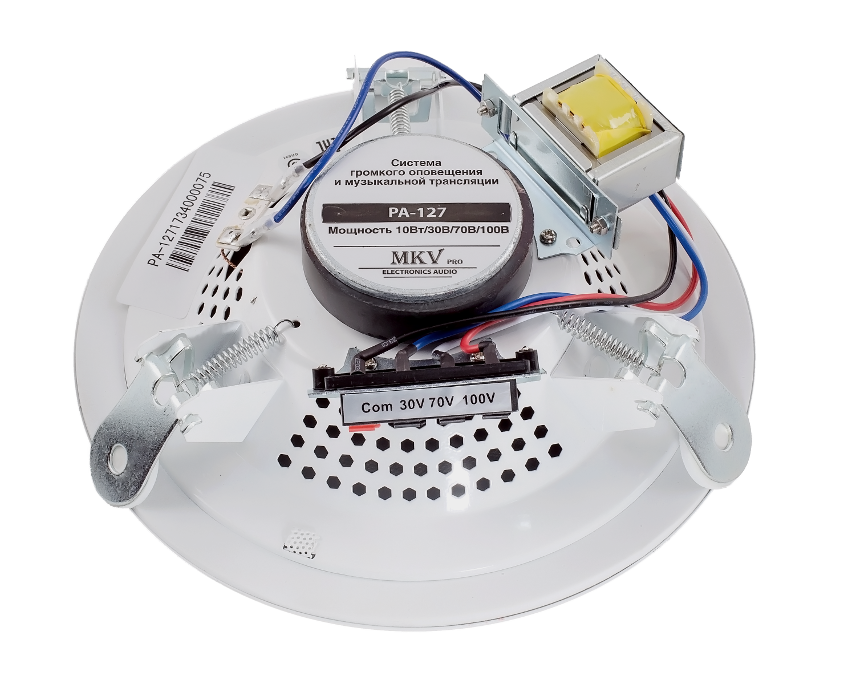 PA-127 - громкоговоритель потолочный, врезной, трансформаторный с выходной мощностью 10 Вт и питанием 30/70/100В предназначен для воспроизведения сигналов ГО и ЧС, речевых сообщений и фоновой музыки. Особенности трансформаторной линии позволяют использовать оповещатель на большой удаленности от основного блока. Используемый динамик обеспечивает высокий уровень звукового давления и отсутствие искажений при передаче звука на большие расстояния.
