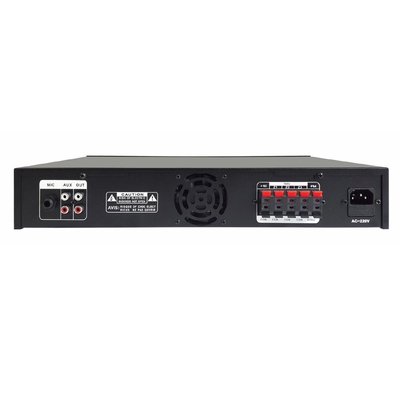 Три зоны трансляции (регулировка громкости в каждой зоне) Выходная мощность 60Вт. Входы: 1 микрофонный, 1 линейный. Выходное напряжение: 100В. Возможность работы на нагрузку сопротивлением 4-16 Ом. Напряжение питания 220В 50 Гц .USB порт для воспроизведения файлов MP3. Bluetooth, Встроенный FM тюнер.Функция прерывания музыкальной трансляции при поступлении сигнала от прибора ОПС и/или удаленного запуска тревожного сообщения (обеспечивается установкой модуля ALERTO FAM-01)