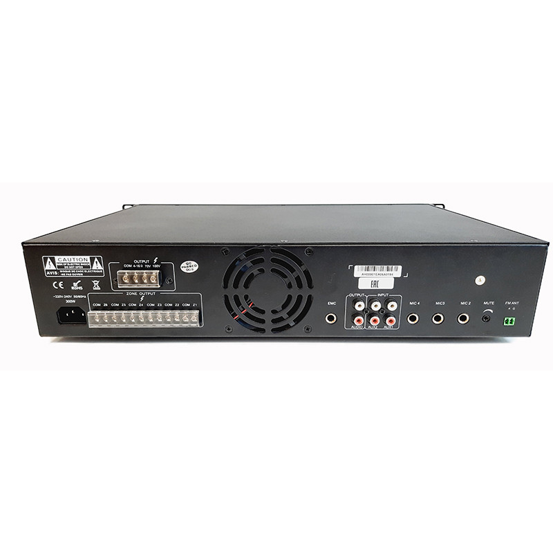 Микшер-усилитель 500Вт, 6 зон трансляции. Индивидуальная регулировка громкости в каждой зоне. 4 микрофонных, 2 линейных входа. МР3 плеер (FM радио, USB, SD, Bluetooth). ИК-пульт ДУ. ЕМ вход с наивысшим приоритетом.