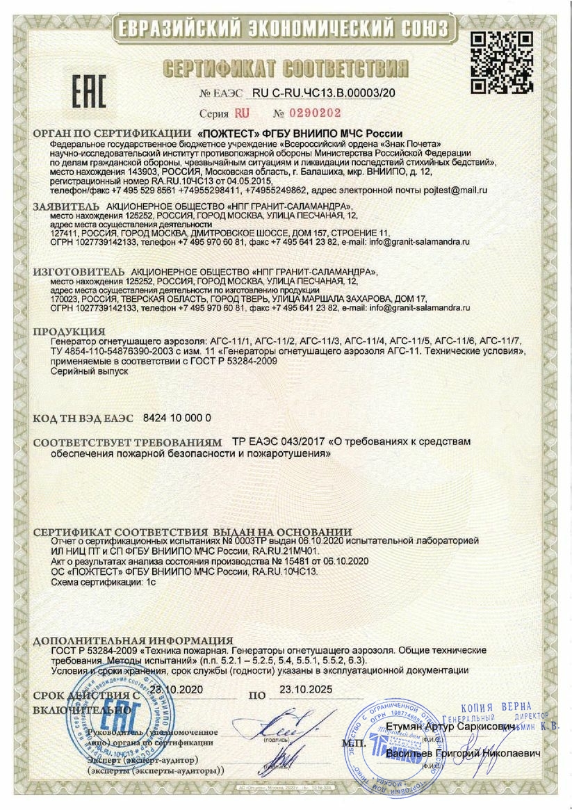 Гранит-Саламандра АГС-11/4-03 – генератор огнетушащего аэрозоля с воздушным охлаждением и массой аэрозолеобразующего заряда 0.9 кг, предназначенный для оперативного тушения воспламененных электроустановок (Е), твердых (А) и жидких (В) горючих веществ по всему объему защищаемого объекта. Эффективно применяется в автоматических установках пожаротушения малогабаритных электротехнических объектов (трансформаторные подстанции, электрические шкафы, кабельные каналы и тоннели), пожароопасных отсеков транспортных средств (автотранспорт, дизельные и электропоезда, локомотивы, вагоны спец. назначения) и других стационарных или передвижных объектов, где тушение прочими способами не рекомендовано в связи с возможностью повреждения оборудования или материально-культурных ценностей. Конструкция Генератор представляет собой прочный металлический корпус из 2-х частей, соединенных между собой болтовыми креплениями, между которыми предусмотрено щелевое отверстие для выброса аэрозоля. Внутри установлен узел запуска и аэрозоле