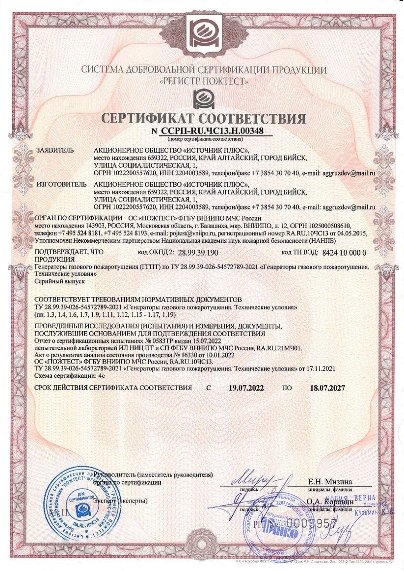Сменный картридж для генераторов газового пожаротушения ГГПТ-1,0, ГГПТ-3,0, ГГПТ-7,0; тушение пожаров классов А2, В и Е; макс. объем тушения - 1 м³; пусковой ток для стационарного / транспортного исполнений - 0.15 А / 0.2 А; ток проверки цепи - 0.03 А; эл. сопротивление пускового устройства - 8-16 Ом; -30...+50 °С.