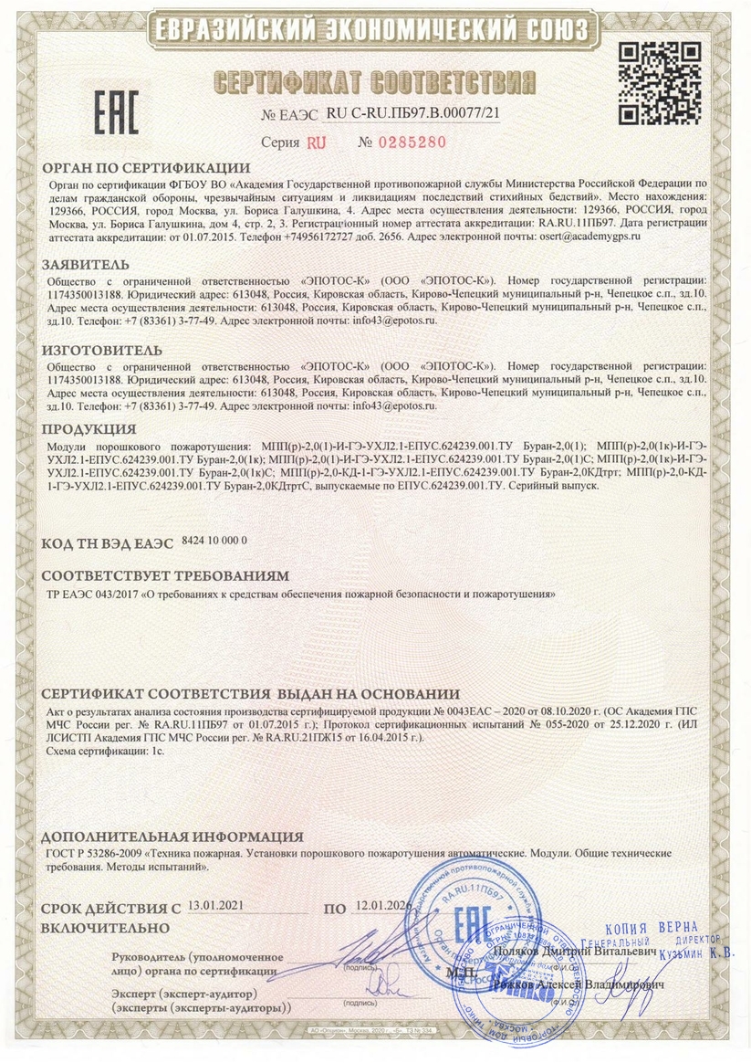 Буран–2,0 – модуль порошкового пожаротушения. Отличительная особенность этого модуля заключается в том, что он может успешно функционировать на объектах с повышенной температурой окружающей среды от-50 ºС до +95 ºС и за счет своей компактной формы устанавливаться в стесненных габаритных условиях.