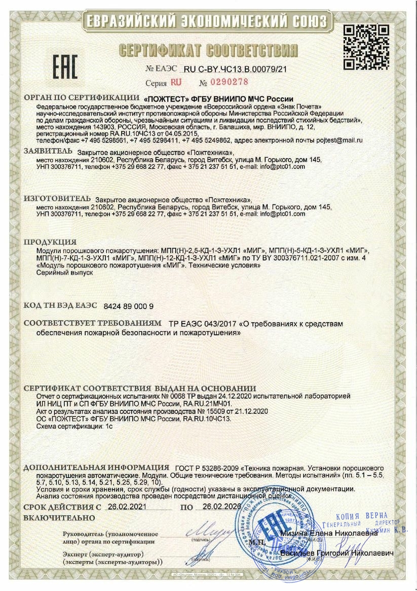 МПП-7/68Б МИГ Модуль порошкового пожаротушения подвесной белый, температура срабатывания +68°С Основные технические данные и характеристики - масса заряда огнетушащего вещества (ОТВ), кг - 6,5±0,3; - вместимость корпуса модуля, л - 7; - масса модуля полная, кг - не более 9,4; - высота крепления модуля, м - 2-4; - защищаемая площадь при тушении модельного очага класса А, м² - не менее 36; - защищаемая площадь при тушении модельного очага класса B, м² - не менее 16; - защищаемый объем при тушении модельного очага класса А, м³ - не менее 75; - защищаемый объем при тушении модельного очага класса B, м³ - не менее 18; - максимальный ранг очага класса В - 34; - габаритные размеры (ВхДиам.), мм - не более 420х185; - рабочее давление в корпусе модуля, МПа - 1,5±0,1; - диапазон температуры эксплуатации, ˚С - от -50 до +50; - тип крепления - настенное и потолочное.
