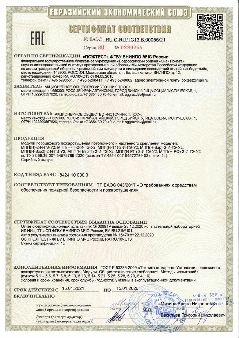 Модуль порошкового пожаротушения потолочного крепления для тушения пожаров классов А, В, С и электрооборудования, находящегося под напряжением в комплекте с сигнально-пусковым устройством УСПАА-1 v5; вместимость корпуса 2.2 л, время действия 1 с, высота установки 2...4 м, защищаемая площадь до 25 кв.м, максимальный ранг пожарака класса В 55В с высоты 4.5 м; t-раб.-50...+50°С, 124х265 мм, 5 кг