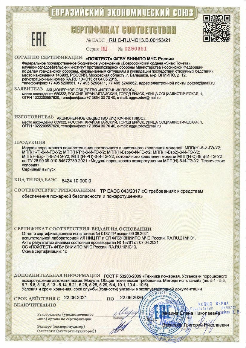 Модуль порошкового пожаротушения потолочного крепления для тушения пожаров классов А, В, С и электрооборудования, находящегося под напряжением в комплекте с сигнально-пусковым устройством УСПАА-1 v5; вместимость корпуса 6.5 л, время действия 1 с, высота установки 2...9 м, защищаемая площадь до 50 кв.м, максимальный ранг пожара класса В 233В с высоты 7 м; t-раб.-50...+50°С, 286х239 мм, 10 кг