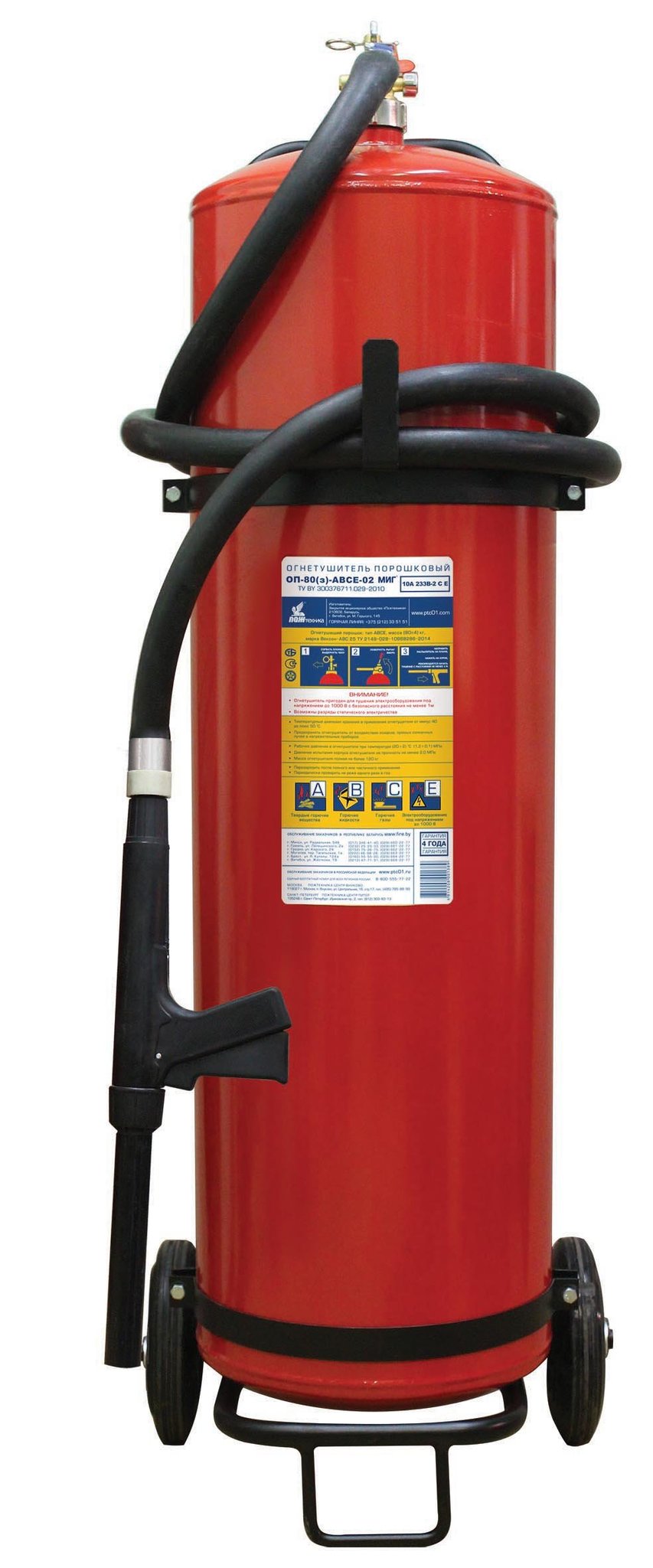 Огнетушитель воздушно-пенный ОВП-80 МИГ ФторПАВ зимний  - передвижной огнетушитель с перекрывным стволом.  Масса заряда огнетушащего вещества - 80 кг. Ранг по модельным очагам: 6А, 233В-2. Диапазон температур эксплуатации от -40 oС до +50 oС.
