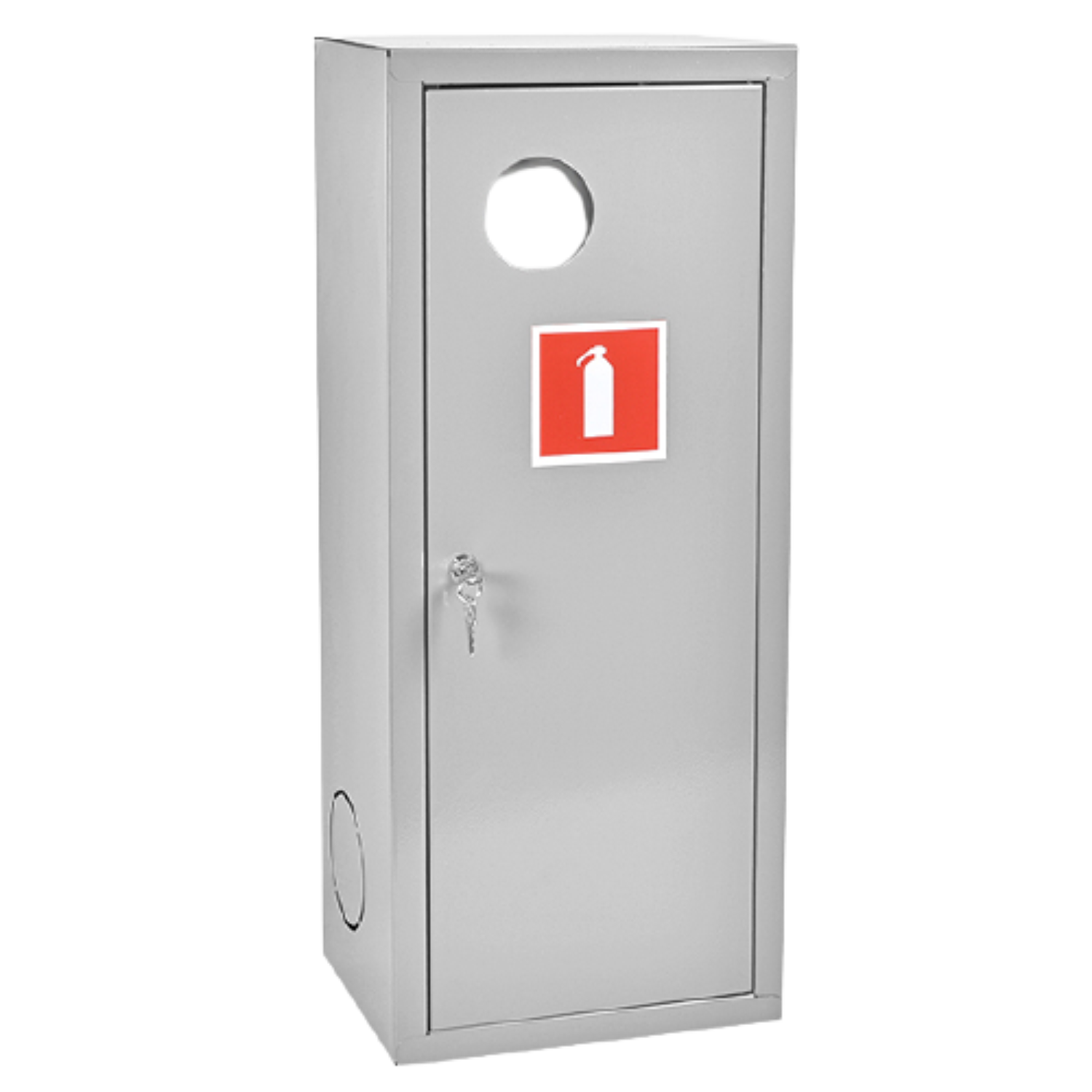 На металлический корпус шкафа, выполненного в виде короба, навешивается глухая дверца, оборудованная замком. На дверце имеется место для запасного ключа, защищенное стеклом.
