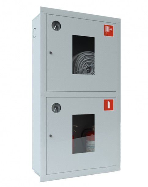 Шкаф для пожарного крана диам. 51/66 мм. Металл, толщиной 0,6 мм — 0,8 мм. встроенный (В), открытый (О), 700х1300х300 (для двух рукавов и двух огнетушителей 300)