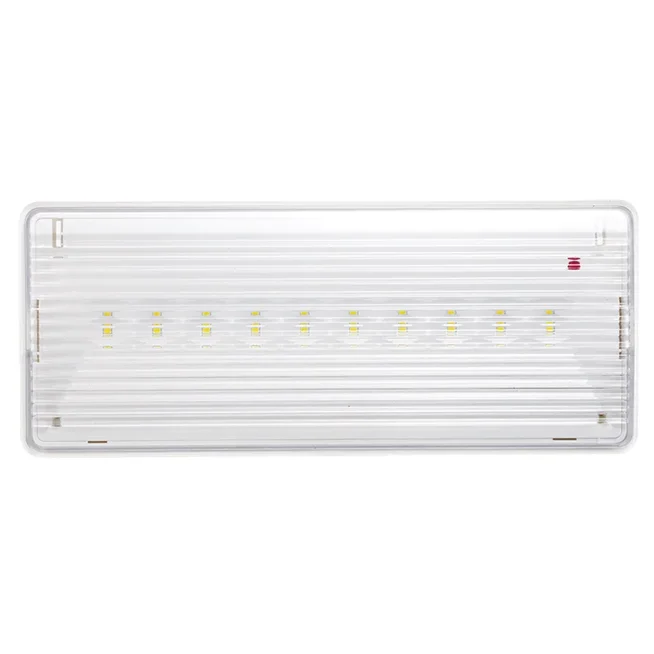 Светильник аварийного освещения светодиодный постоянного/непостоянного действия; 10 SMD светодиодов, световой поток 150 Лм, цвет.температура 6500 К; U-пит.187...242В, P-потр. 3 Вт, встроенный Li-ion АКБ 3.7В (тип 18650), емкостью 1200 мАч, защита аккумулятора от глубокого разряда и перезаряда, время свечения - до 3 часов; IP54, t-раб.0...+40°С, габ.размеры 257х104х37 мм , 0.32 кг