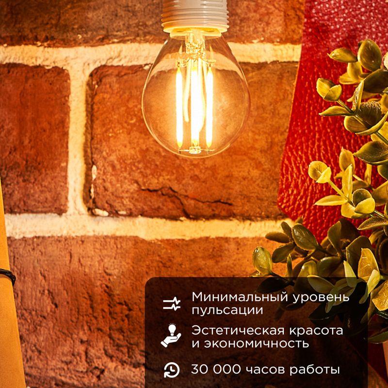 Филаментная прозрачная лампа REXANT GL45 в форме шара мощностью 9.5Вт с цоколем E14 и с теплым белым свечением в 2700K прекрасно подходит для дизайнерского освещения комнат, домов, гостиниц, кафе, и других объектов. Филаментные светодиодные лампочки вобрали в себя все лучшие свойства, присущие матричным LED-лампам и традиционным лампам накаливания. Они обладают высокой энергоэффективностью и долгим сроком службы. За счет распространения света во всех направлениях, филаментные лампочки REXANT потребляют еще меньше электроэнергии при более высокой яркости. Утилизации ламп не требует особых мер. Их можно вынести с бытовыми отходами, так как они безопасны и для окружающей среды.